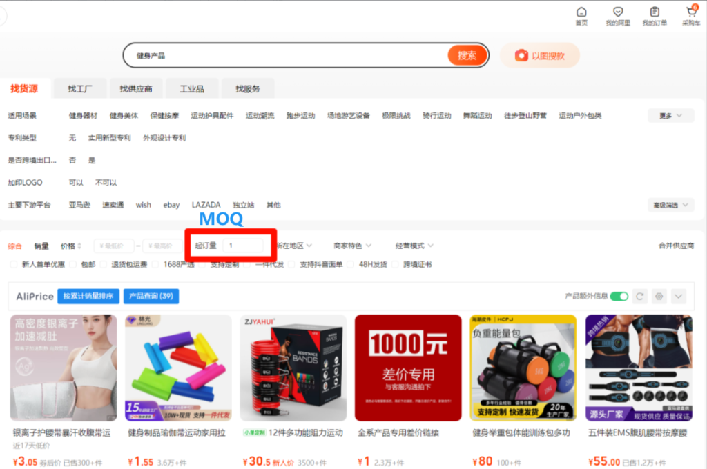 Additionally, set the minimum order quantity (MOQ) to 1 to view products available for purchase in smaller quantities.